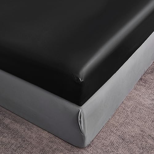 JHCHMX Satin Black Fitted Sheet King Size,Deep Pocket Silkly King Bed Sheet,Soft Satin& Wrinkle Resistant Fitted Bed Sheet Black King 153x203cm