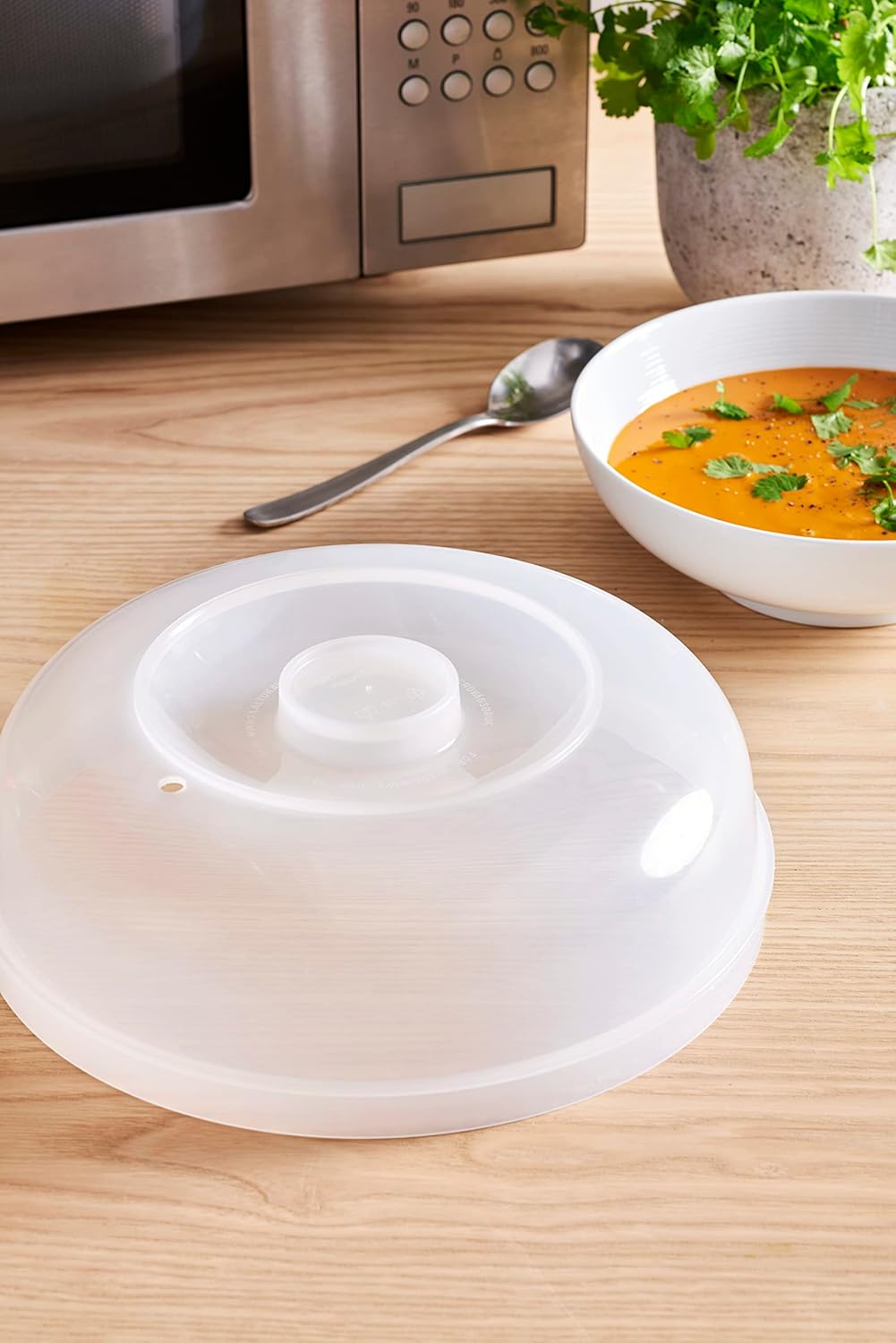 - VERSATILE PLATE COVERS FOR FOOD: This lid (25cm x 8cm) fits inside most microwave ovens, including smaller models. It can also double as a cake cover or keep food warm while you’re busy with other steps of cooking.