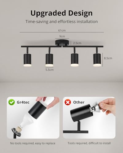 Replaceable GU10 Bulbs: Light heads size: 85mm*55mm. Gr4tec black ceiling light can be matched with different types of GU10 bulbs such as monochrome, dimmable and smart light source according to different scenes. You can choose the suitable light source according to your individual needs to achieve the desired lighting effect.